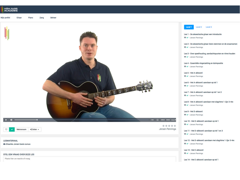 Je volgt een elektrische gitaarles eenvoudig online. De lessen worden gegeven door middel van interactieve video’s die je op ieder moment opnieuw bekijkt of pauzeert. Hierdoor leer je op je eigen tempo een elektrische gitaar bespelen. Heb je meer tijd nodig voor bepaalde akkoorden? Pauzeer de video dan eenvoudig en oefen deze wat langer. Je kunt zelfs vragen stellen aan de docenten. Ze beantwoorden deze snel of verwijzen je naar de veel gestelde vragen als daar het antwoord te vinden is. Zo ontvang je voor de lage prijs van €14,95 per maand een volwaardige online elektrische gitaarles. Er staan honderden lessen online en er komen wekelijks nieuwe lessen bij.